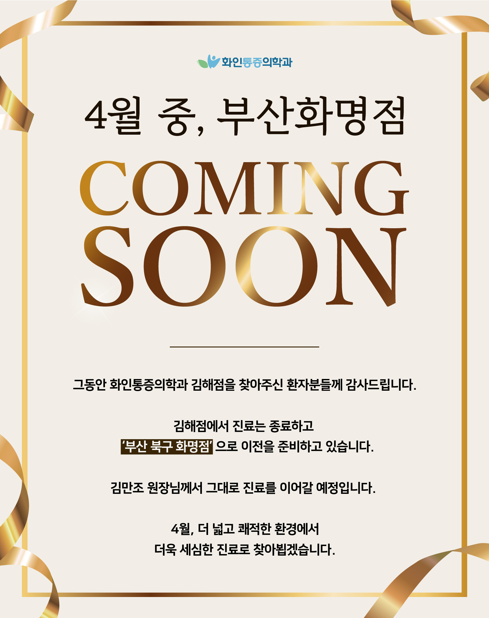 안녕하세요, 화인통증의학과입니다.4월부터 김해점이 부산화명점으로 이전하게 되어 소식 전달드립니다. 그동안 화인통증의학과 김해점을 찾아주신 모든 환자분들께 감사드립니다. 원장님은 화명점에서 계속 진료를 이어가실 예정이며, 4월에 더 넓고 쾌적한 환경에서 더욱 세심한 진료로 찾아뵙겠습니다. 감사합니다.